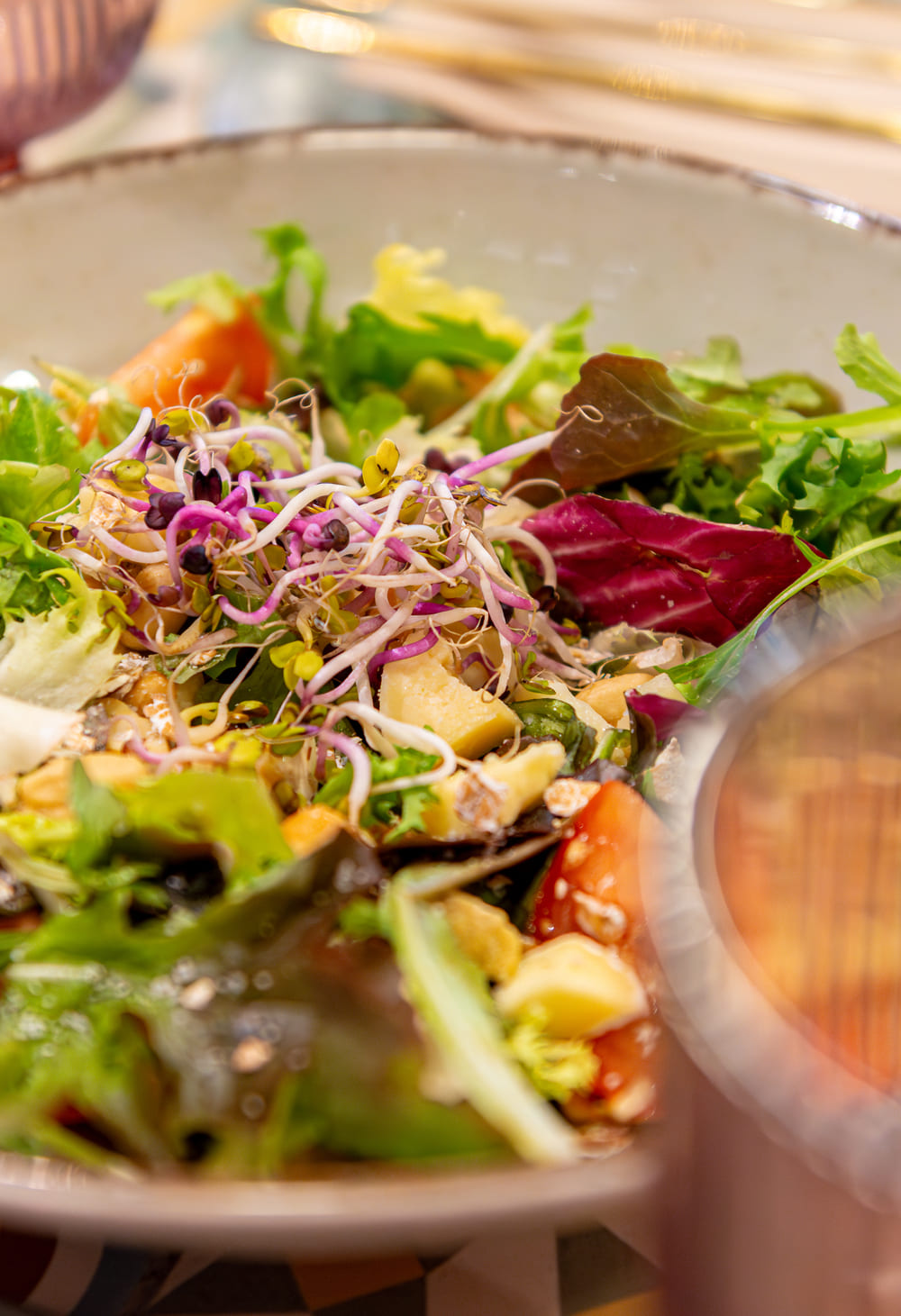 Lechuga mezclum, tomate cherry, semillas, queso brie, queso viejo manchego y muesly. Aderezado con vinagreta especial de nuestra chef.