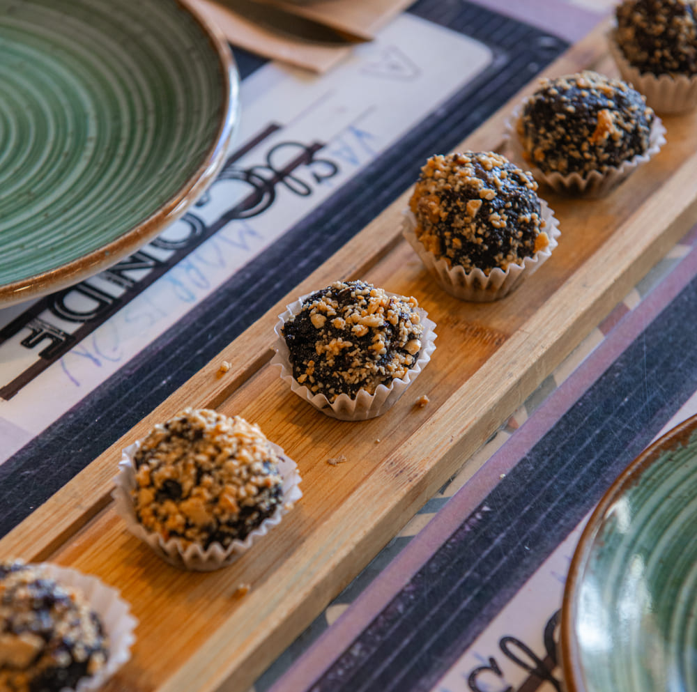 Bolas de morcilla de cebolla con crocante de cacahuete.